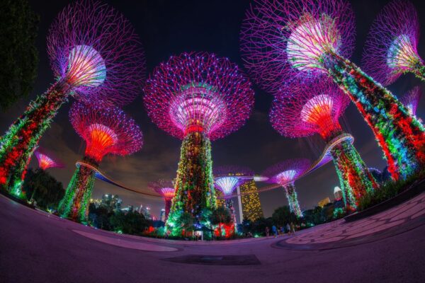 Các “Siêu cây” khổng lồ tại đây sẽ lấy năng lượng mặt trời vào ban ngày và tự tỏa sáng vào ban đêm. Với cảnh quan tuyệt vời, Gardens by the Bay trở thành một biểu tượng thu hút khách du lịch của Singapore .