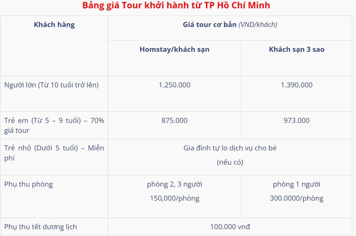 | Lưu trú: | Tiêu chuẩn homstay/khách sạn (trừ trường hợp mùa cao điểm hết homestay sẽ thay thế bằng khách sạn tương đương). |