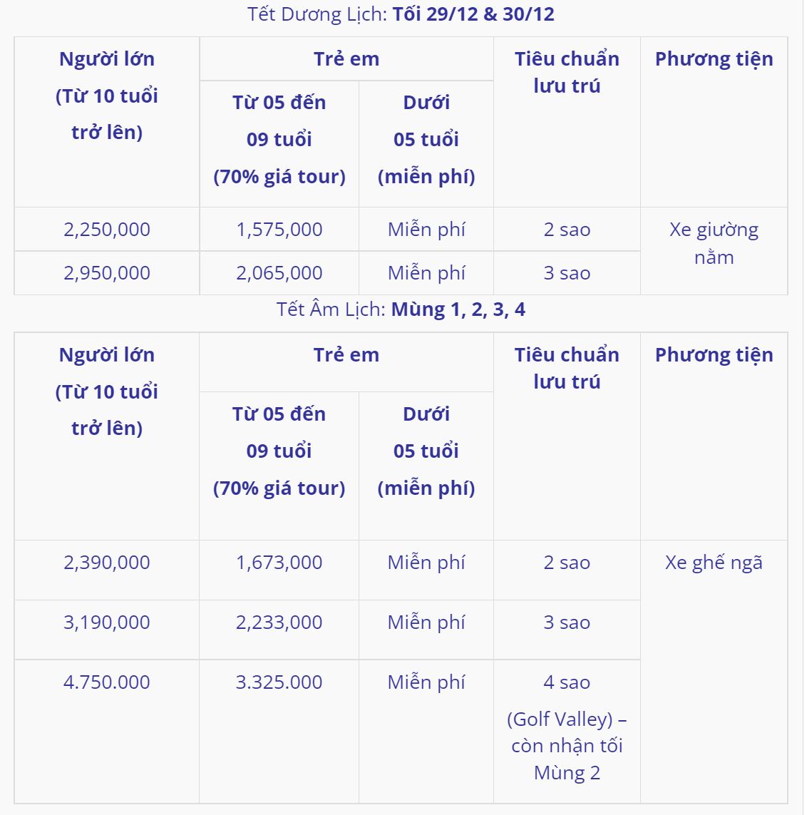 | Dưới 05 tuổi | Miễn phí | – Không tính vé, gia đình tự lo cho bé.– 02 người lớn chỉ được kèm 01 trẻ em từ 05 tuổi trở xuống, trẻ em thứ 02 trở lên phải mua 70% giá tour.