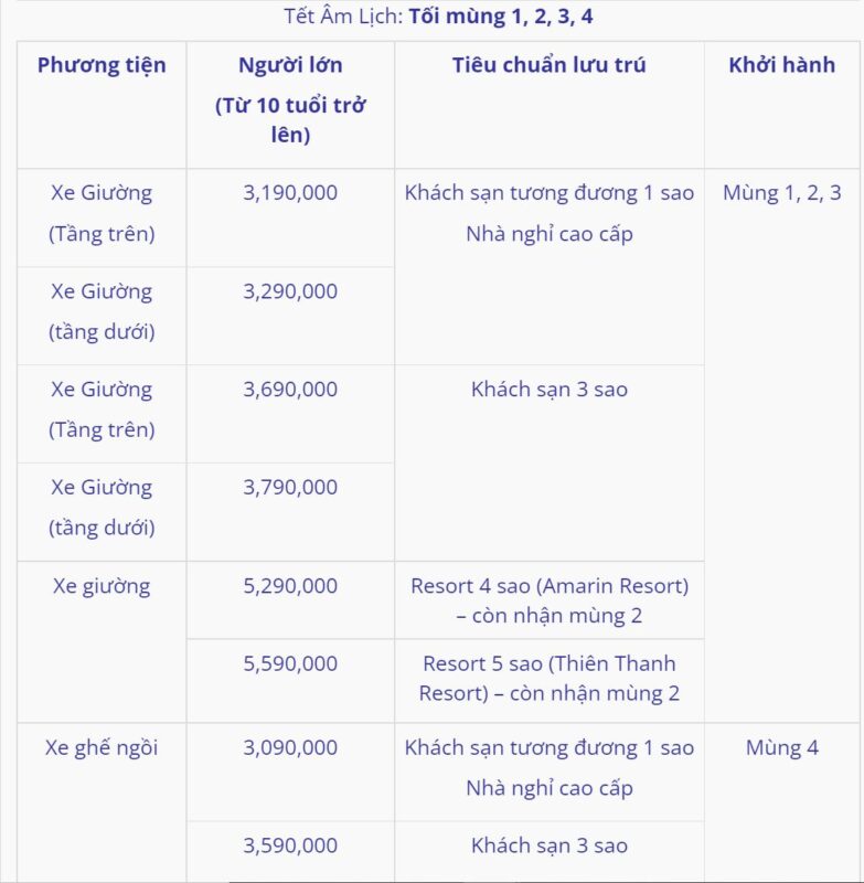 | Khách sạn 1 sao (vnđ/phòng/tour) | Khách sạn 3 sao (vnđ/phòng/tour) | Resort 4 sao (vnđ/phòng/tour) | Resort 5 sao (vnđ/phòng/tour) |