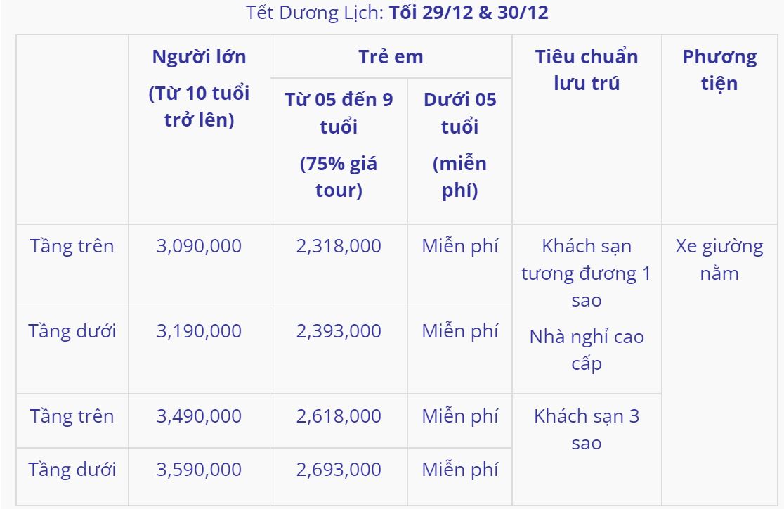 | Lưu trú | – Khách sạn 1 sao hoặc nhà nghỉ cao cấp (tiêu chuẩn 4 – 6 khách/phòng).– Khách sạn 3 sao (tiêu chuẩn 2 – 3 – 4 khách/phòng).