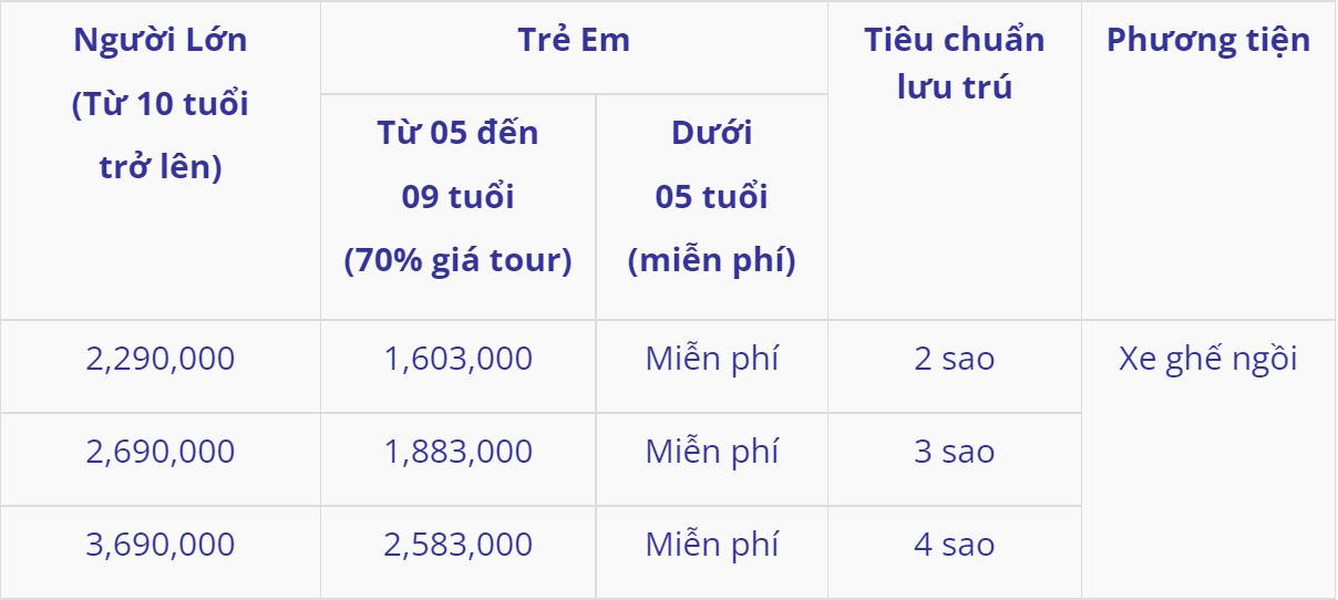 | Dưới 05 tuổi | Miễn phí | – Không tính vé, gia đình tự lo cho bé.– 02 người lớn chỉ được kèm 01 trẻ em từ 05 tuổi trở xuống, trẻ em thứ 02 trở lên phải mua 70% giá tour.