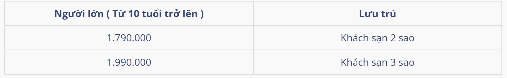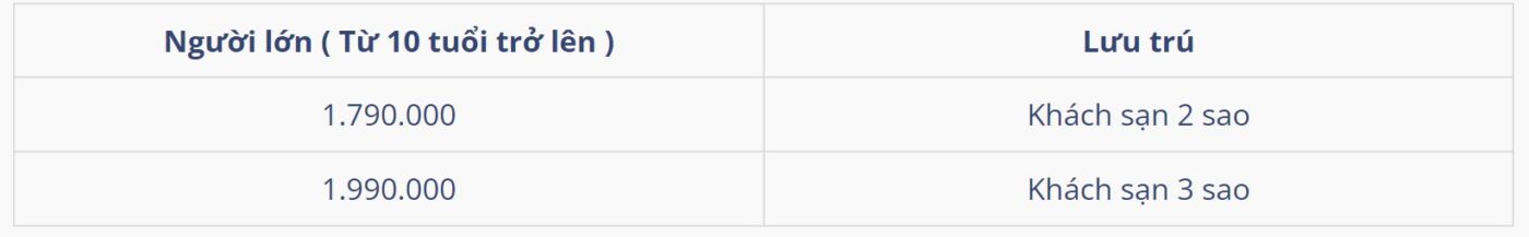| Dưới 05 tuổi | Miễn phí | Không tính vé, gia đình tự lo cho bé.02 người lớn chỉ được kèm 01 trẻ em từ 05 tuổi trở xuống, trẻ em thứ 02 trở lên phải mua 70% giá tour.