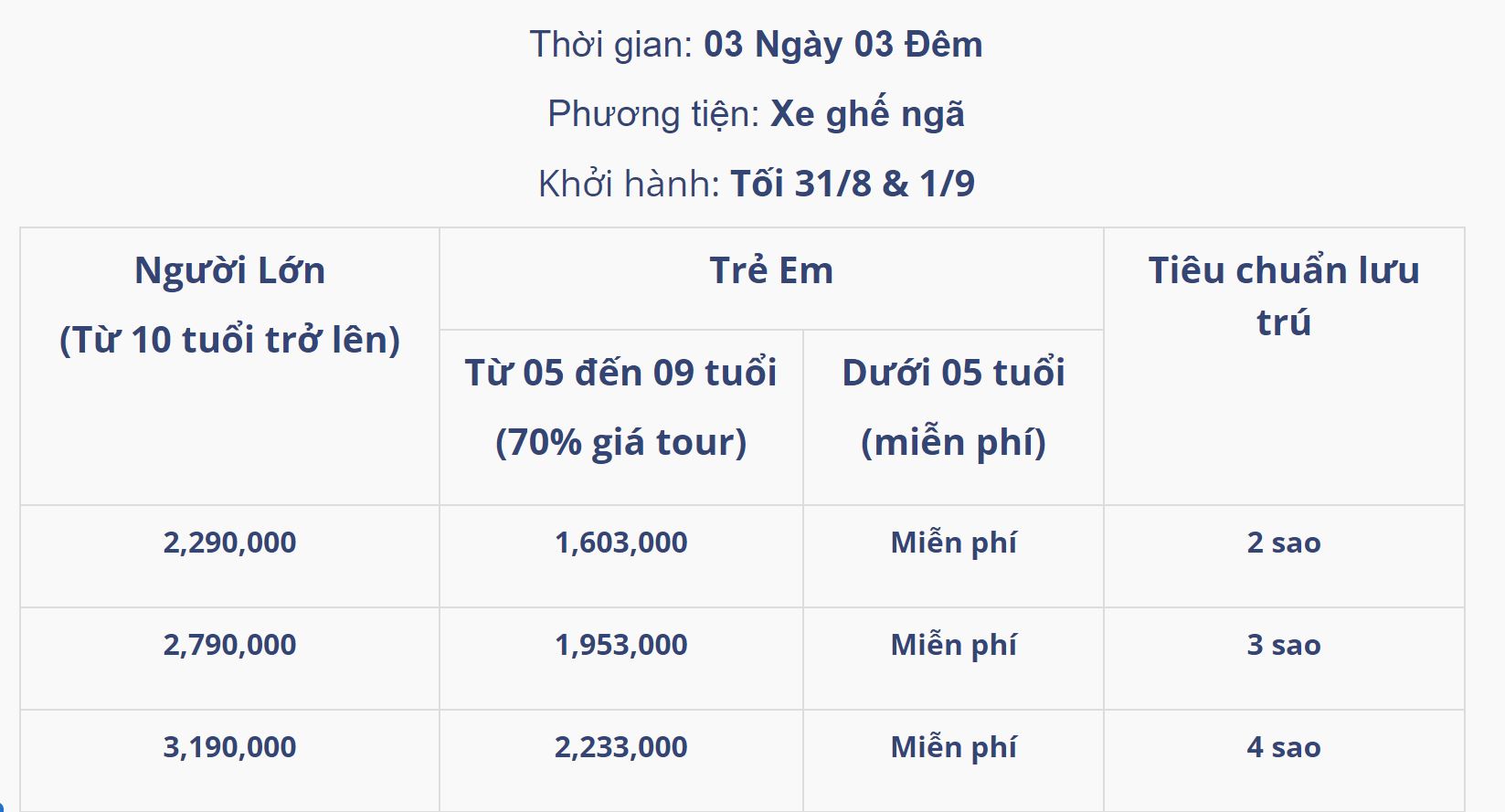| Từ 05 đến 09 tuổi: | 70% | – Tiêu chuẩn: 01 ghế ngồi trên xe, suất ăn, vé tham quan, không có suất ngủ – bé ngủ chung với gia đình.– 02 người lớn chỉ được kèm 1 trẻ em 70% vé, trẻ em thứ 2 trong độ tuổi trên bắt buộc mua 1 vé người lớn. |